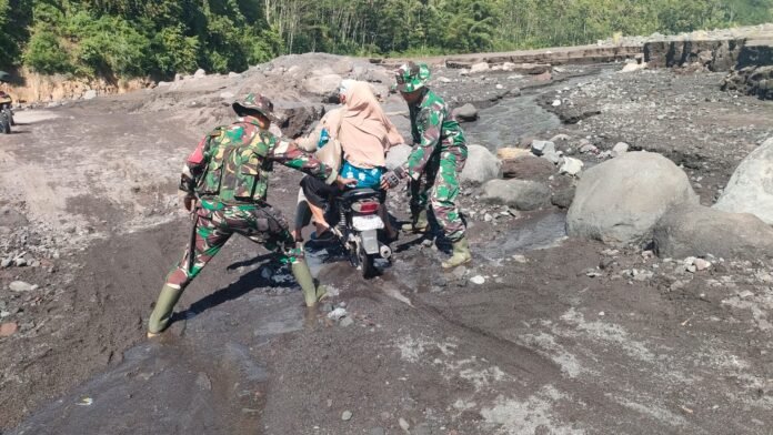 Lumajang – Wujud kepedulian TNI kepada masyarakat kembali terlihat di tengah upaya penanganan darurat pasca erupsi Gunung Semeru. Anggota Kodim 0821/Lumajang, Pelda Rudi Rusmianto yang kesehariannya menjabat sebagai Batuud Koramil 0821-15/Tekung, turun langsung membantu warga menyebrangi sungai di Desa Supiturang, Kecamatan Pronojiwo, wilayah yang terdampak cukup parah akibat material vulkanik. Rabu(3/12/2025)