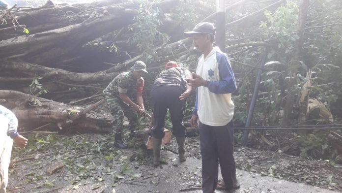Lumajang, Bersama warga dan relawan, Babinsa Bodang Koramil 0821/20 Padang Serda Hendri Tri Cahyono, bergotong royong bersihkan material pohon yang tumbang di Jembatan perbatasan di Dusun Kayugedang RT 009 RW 011 Desa Bodang Kecamatan Padang Kabupaten Lumajang, Jawa Timur, Jumat (26/1/2024).
