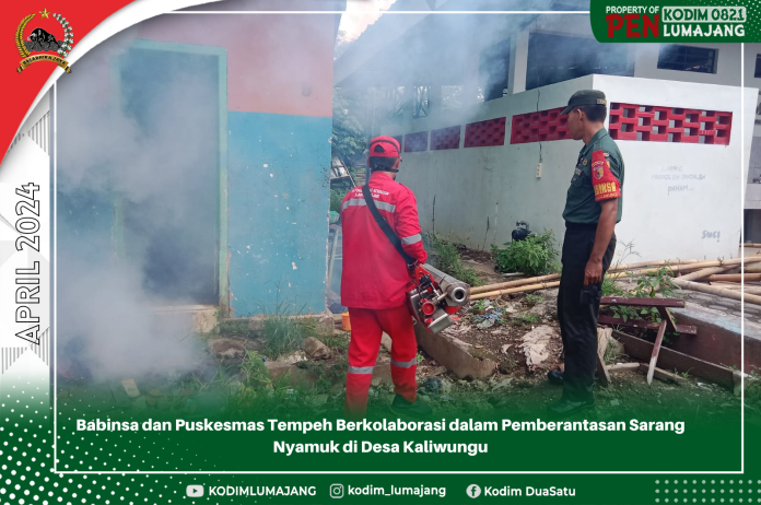 Lumajang, Dalam upaya menjaga kesehatan masyarakat, Babinsa  Kaliwungu Koramil 0821/10 Tempeh Serma Agus Rozak, turut serta melaksanakan pendampingan terhadap kegiatan pemberantasan sarang nyamuk di wilayahnya. Kolaborasi ini terwujud melalui pendampingan kegiatan Puskesmas Tempeh, dalam pelaksanaan pengasapan atau fooging di Dusun Krajan dan Dusun Karangsari, Desa Kaliwungu, Kecamatan Tempeh, Kabupaten Lumajang, Jawa Timur Rabu (3/4/2024).