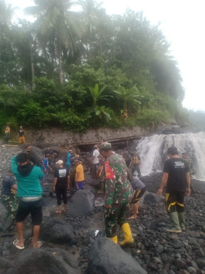 Lumajang, Dalam semangat kebersamaan dan kepedulian terhadap kondisi masyarakat pasca bencana, Babinsa Jugosari Koramil 0821-09/Candipuro, Serma Novi Wahyu Santoso, turut serta membantu personel Yonif 527/BY dan warga masyarakat melaksanakan kerja bakti pembuatan jalan darurat di Dusun Sumber Langsep, Desa Jugosari, Kecamatan Candipuro, Kabupaten Lumajang, Jawa Timur, Sabtu (24/5/2025).