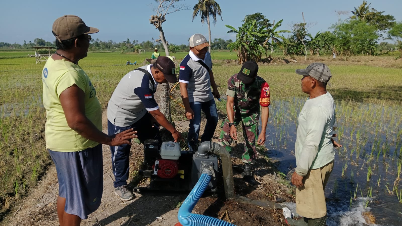 Lumajang, Babinsa Kraton Koramil 0821/11 Yosowilangun, Sertu Puryatno, melakukan pendampingan dalam kegiatan pompanisasi bersama kelompok tani (Poktan) Ngudi Tani di Rowo Krasak, Dusun Sido Dadi, Desa Kraton, Kecamatan Yosowilangun, Kabupaten Lumajang, Jawa Timur, pada Minggu (7/7/2024).