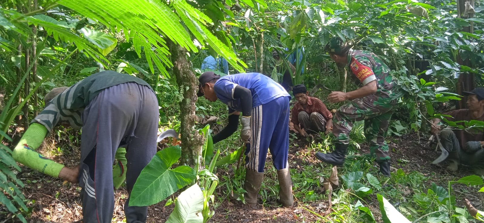 Lumajang, Babinsa Kenongo Koramil 0821/04 Gucialit, Serda Herman, terjun langsung membantu pembersihan kebun kopi milik Marsikin di Dusun Margo Mulyo RT 001 RW 006, Desa Kenongo, Kecamatan Gucialit, Kabupaten Lumajang, Jawa Timur, Kamis (23/5/2024).