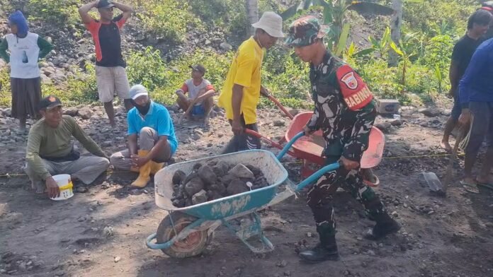 Lumajang, Upaya meningkatkan Semangat gotong royong Babinsa Kloposawit Koramil 0821-09/Candipuro, Serda Moch. Dedik Indra Irawan, bersama warga melaksanakan kerja bakti perbaikan jalan Desa Kloposawit, Kecamatan Candipuro, Kabupaten Lumajang, Jawa Timur, pada Rabu (1/10/2025).
