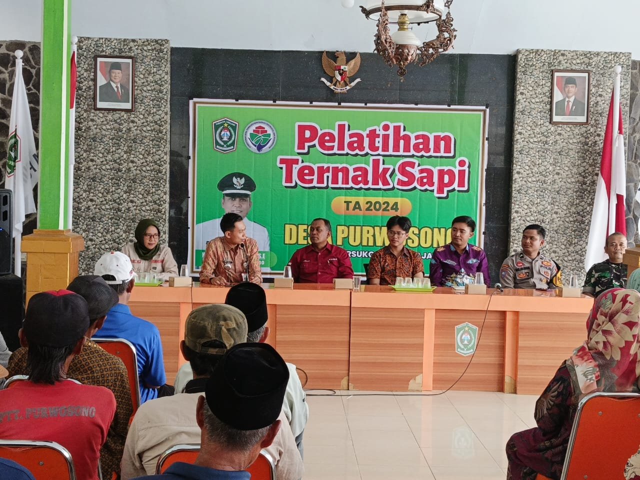 Lumajang, Sebagai bentuk dukungan terhadap peningkatan ekonomi masyarakat melalui sektor peternakan, Babinsa Purwosono Koramil 0821-19/Sumbersuko, Sertu Masrohim Atmajaya Putra, turut serta dalam pendampingan kegiatan Sosialisasi Pelatihan Ternak Sapi yang diselenggarakan di Balai Desa Purwosono, Kecamatan Sumbersuko, Kabupaten Lumajang, Jawa Timur, pada Jumat (15/11/2024).