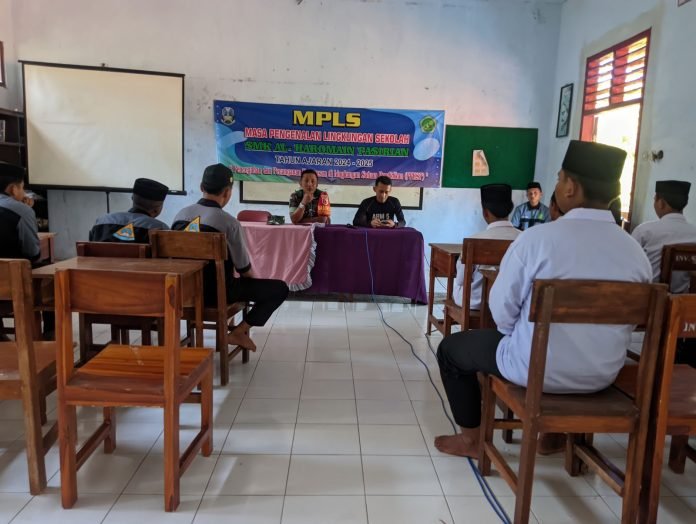 Lumajang, Dalam rangkaian Masa Pengenalan Lingkungan Sekolah (MPLS), Sertu Firdaus Dhardiansyah, Babinsa Selok Ayar dari Koramil 0821/08 Pasirian, memberikan materi wawasan kebangsaan kepada para siswa baru di SMK Al-Harumain, Dusun Tempuran, Desa Selok Anyar, Kecamatan Pasirian, Kabupaten Lumajang, Jawa Timur, Selasa (16/7/2024)