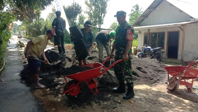 Lumajang, Wujud nyata semangat gotong royong dengan swadaya masyarakat, Babinsa Sidomulyo Koramil 0821-14/Pronojiwo, Serma Ikhwanurudin, bersama Kelompok Sadar Wisata (Pokdarwis) Wana Wisata Pinus Sewu dan warga setempat melaksanakan kerja bakti pembangunan jalan rabat beton yang menghubungkan RW 009 dengan RW 011 di Dusun Krajan, Desa Sidomulyo, Kecamatan Pronojiwo, Kabupaten Lumajang, Jawa Timur, pada Jumat (22/8/2025).