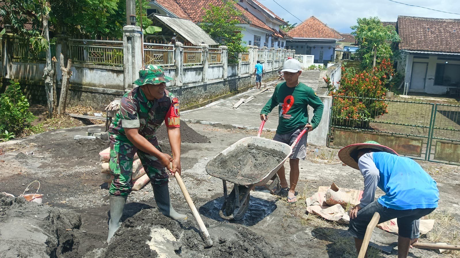 Lumajang, Komitmen TNI dalam mendukung percepatan pembangunan wilayah desa. Babinsa Sukosari Koramil 0821-12/Jatiroto Serka Samsuliadi Dwi Purwanto melaksanakan pendampingan pembangunan jalan lingkungan dengan paving blok di Dusun Sukosari Barat RT 002 RW 001, Desa Sukosari, Kecamatan Jatiroto, Kabupaten Lumajang, Jawa Timur, pada Minggu (14/12/2025).