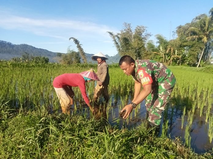 Lumajang, Dalam rangka mendukung program ketahanan pangan nasional serta peningkatan kesejahteraan masyarakat di wilayahnya, Babinsa Sumberurip Koramil 0821/14 Pronojiwo Sertu Januar Adi Hidayat, telah melakukan kegiatan pendampingan pertanian, pada tahap penyiangan padi bersama Kelompok Tani ‘Sumber Rejeki’ di Dusun Krajan Desa Sumberurip Kecamatan Pronojiwo Kabupaten Lumajang, Jawa Timur, Selasa (16/4/2024).