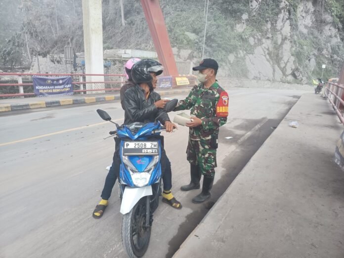 Selain melakukan penyekatan dan pengaturan kendaraan, Serka Nur Hadi bersama personel lain juga melaksanakan pembagian masker kepada para pengendara motor. Langkah ini dilakukan sebagai bentuk antisipasi terhadap paparan debu vulkanik yang kerap terbawa angin di sekitar area Besuk Kobokan.
