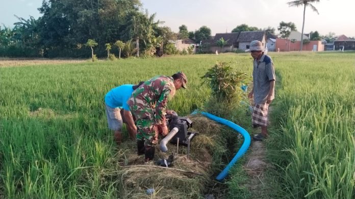 Lumajang, Babinsa Kebonagung Koramil 0821/02 Sukodono, Sertu Lolok Wahyudi Hariyanto, melaksanakan pendampingan pengairan lahan padi milik Bunayan, anggota kelompok tani Karya Agung seluas 0,8 hektar, yang berada di Dusun Kebonagung Kidul RT 001 RW 003, Desa Kebonagung, Kecamatan Sukodono, Kabupaten Lumajang, Jawa Timur, pada Sabtu (3/8/2024).