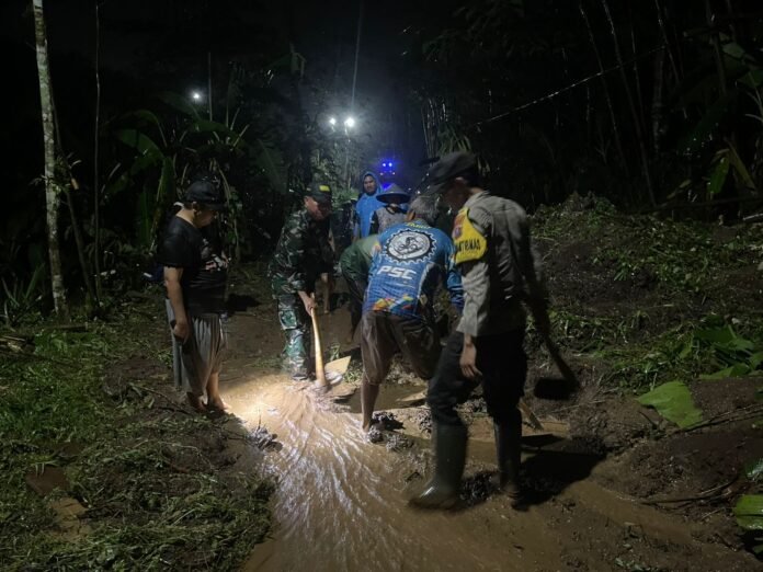 Kerja bakti pembersihan material longsor dilakukan guna membuka kembali akses jalan utama warga yang sempat tertutup lumpur dan batu besar. Babinsa, Bhabinkamtibmas, serta masyarakat setempat bahu-membahu membersihkan sisa material dengan peralatan seadanya, penuh semangat gotong royong dan kepedulian sosial.