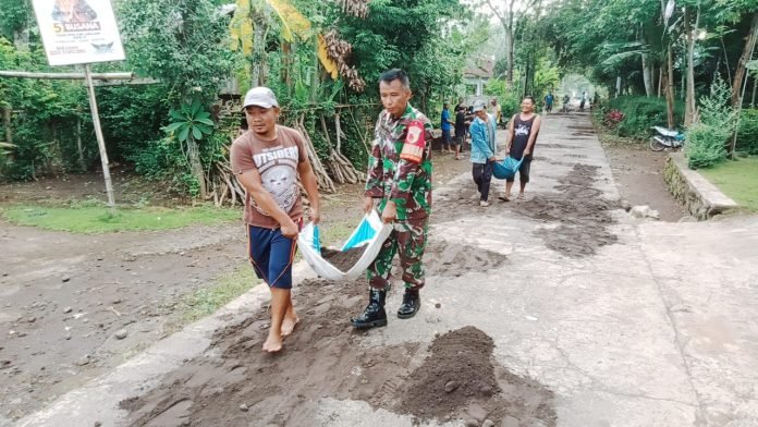 Lumajang, Dalam upaya menjaga fasilitas umum untuk kenyamanan masyarakat dan pengguna jalan, Babinsa Tempursari Posramil 0821/21 Kedungjajang Serka Muh. Soli bersama warga Bantu Pemerintah desa melaksanakan perbaikan jalan di Dusun Ketindan RT 002 RW 001 Desa Tempursari Kecamatan Kedungjajang Kabupaten Lumajang, Jawa Timur, Rabu (6/2/2024).