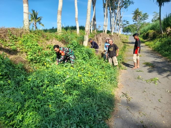 Lumajang, Semangat gotong Royong, Babinsa Mojosari Koramil 0821/19 Sumbersuko, Sertu Imam Nawawi, melaksanakan kegiatan kerja bakti bersama warga pembersihkan ruas kanan kiri jalan sepanjang 250 meter, di Dusun Darungan Desa Mojosari Kecamatan Sumbersuko Kabupaten Lumajang, Jawa Timur. Kegiatan yang dilaksanakan pada Senin (20/5/2024).