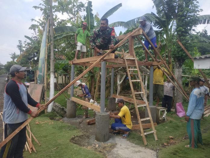 Lumajang, Sebagai upaya meningkatkan Keamanan Lingkungan, Babinsa Sidorejo Koramil 0821/16 Rowokangkung Kopda Ali Ridwan, bersama warga bergotong royong renovasi Pos Kamling di Dusun Wungurejo Desa Sidorejo Kecamatan Rowokangkung Kabupaten Lumajang, Jawa Timur, Sabtu (3/2/2024).