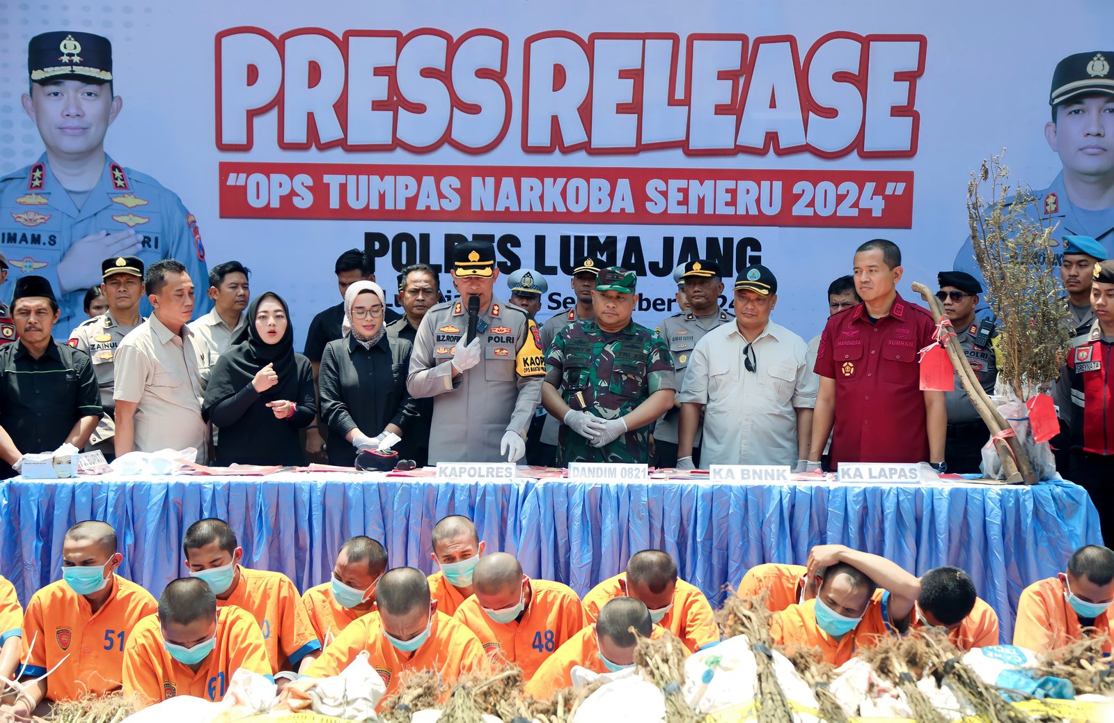 Lumajang – Komandan Kodim 0821 Lumajang, Letkol Inf Ronny Wijaya Koesuma, turut menghadiri acara Press Release Operasi Tumpas Narkoba Semeru 2024 yang digelar oleh Polres Lumajang di halaman Mapolres Lumajang pada Sabtu (28/9/2024). Acara ini menyoroti keberhasilan Polres Lumajang dalam mengungkap sejumlah kasus narkoba yang terjadi di wilayah Lumajang.