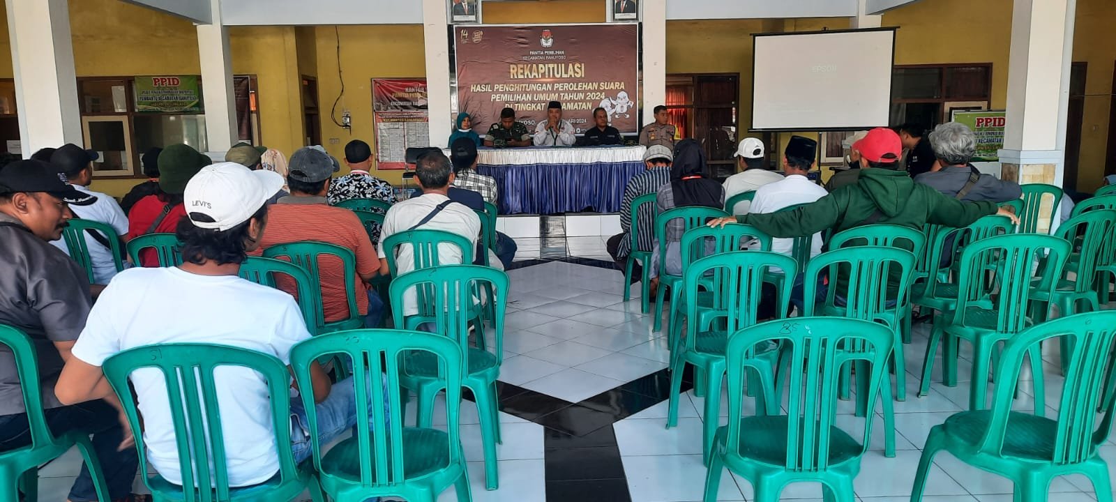 Lumajang, Pengamanan dalam mengawal proses penghitungan, Panitia Pemilihan Kecamatan (PPK) Ranuyoso yang menggelar rapat pleno terbuka hasil rekapitulasi pemungutan suara Pemilu 2024 tingkat PPK, yang bertempat di pendopo Kecamatan Ranuyoso Kabupaten Lumajang, Jawa Timur, Senin (18/2/2024).
