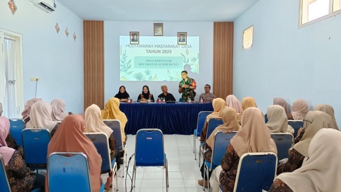 Lumajang, Dalam upaya memperkuat sinergi lintas sektor dalam penanganan stunting, Babinsa Kebonsari Koramil 0821-19/Sumbersuko, Kopda Hendra Setiawan, menghadiri kegiatan Sosialisasi Musyawarah Masyarakat Desa (MMD) Rembug Stunting yang digelar di Kantor Desa Kebonsari, Kecamatan Sumbersuko, Kabupaten Lumajang, Jawa Timur, pada Kamis (30/4/2025).