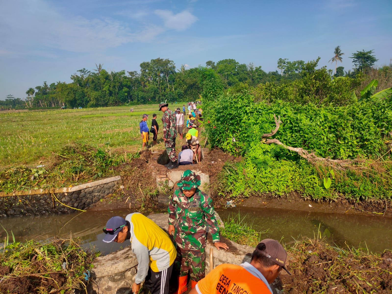 Lumajang, Personel TNI Koramil 0821/16 Rowokangkung melaksanakan kerja bakti pembersihan saluran irigasi tersier Vak 10 sepanjang 300 meter berlokasi di lahan sawah Dusun Pakeman Desa Sumbersari Kecamatan Rowokangkung Kabupaten Lumajang, Jawa Timur, Jumat (26/1/2024).