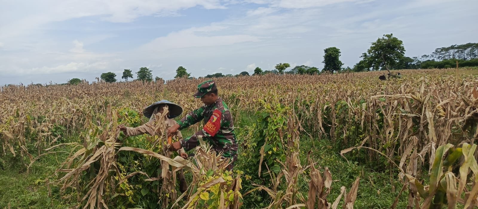 Lumajang, Dalam upaya mendukung ketahanan pangan nasional, Babinsa Grati Koramil 0821-19/Sumbersuko, Serda Ardiyoso, melaksanakan pendampingan kepada petani dalam panen jagung di lahan seluas 0,8 hektar milik Suwari, anggota Kelompok Tani (Poktan) Rais Kiri di Dusun Curah Jero, Desa Grati, Kecamatan Sumbersuko, Kabupaten Lumajang, Jawa Timur, Kamis (16/1/2025).