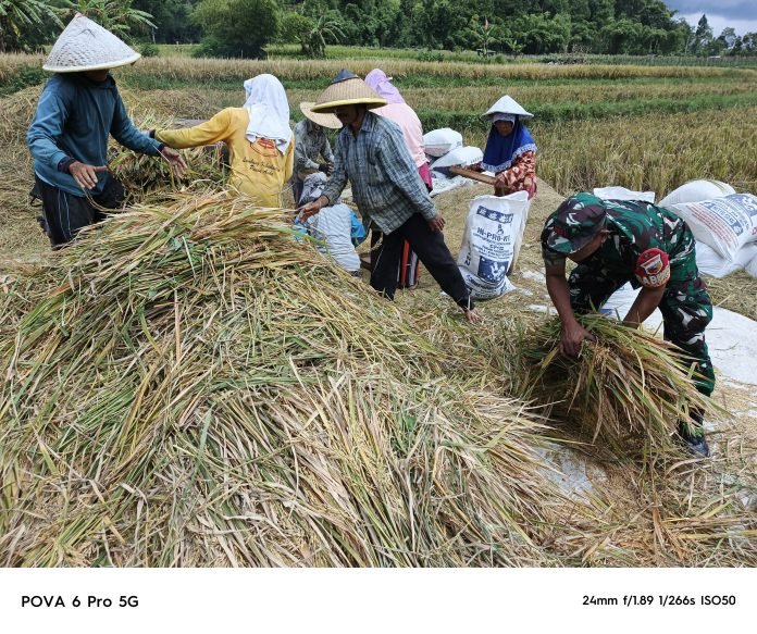 Lumajang, Dalam upaya mendukung ketahanan pangan nasional, Babinsa Oro Oro Ombo Koramil 0821-14/Pronojiwo, Serda Yayat Sugiat, melaksanakan pendampingan panen padi di lahan pertanian seluas 1 hektar milik Kadiran, anggota Kelompok Tani (Poktan) Tani Maju 2, di Dusun Kebonan, Desa Oro Oro Ombo, Kecamatan Pronojiwo, Kabupaten Lumajang, Jawa Timur, Selasa (14/1/2025).