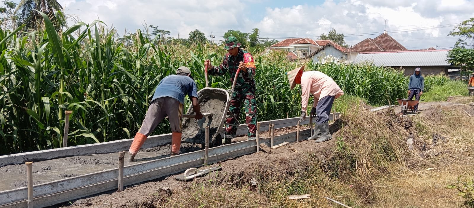 Kasun Bulak Wareng, Misbah, turut menyampaikan apresiasinya atas partisipasi Babinsa dan warga setempat, yang bersama-sama bergotong royong mengangkut material seperti semen, pasir, dan batu split untuk menyelesaikan jalan rabat beton. Proses pengerjaan dilakukan secara manual dengan semangat tinggi dari seluruh pihak yang terlibat.
