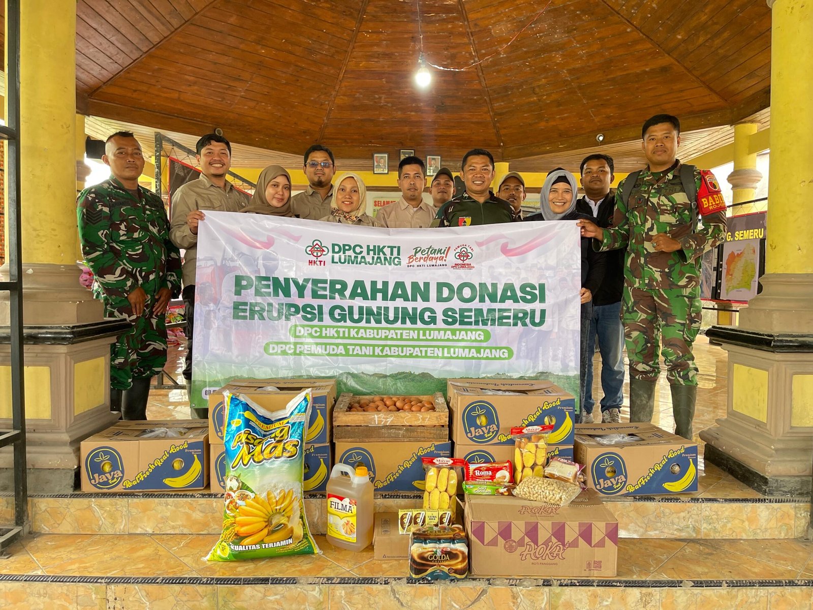 Bantuan tersebut berasal dari Dewan Pimpinan Cabang Himpunan Kerukunan Tani Indonesia (DPC HKTI) Lumajang, yang diketuai Bapak Jamal. Paket bantuan meliputi hasil pertanian segar, minyak goreng, dan susu—kebutuhan penting yang sangat diperlukan untuk mendukung ketahanan pangan warga terdampak erupsi.