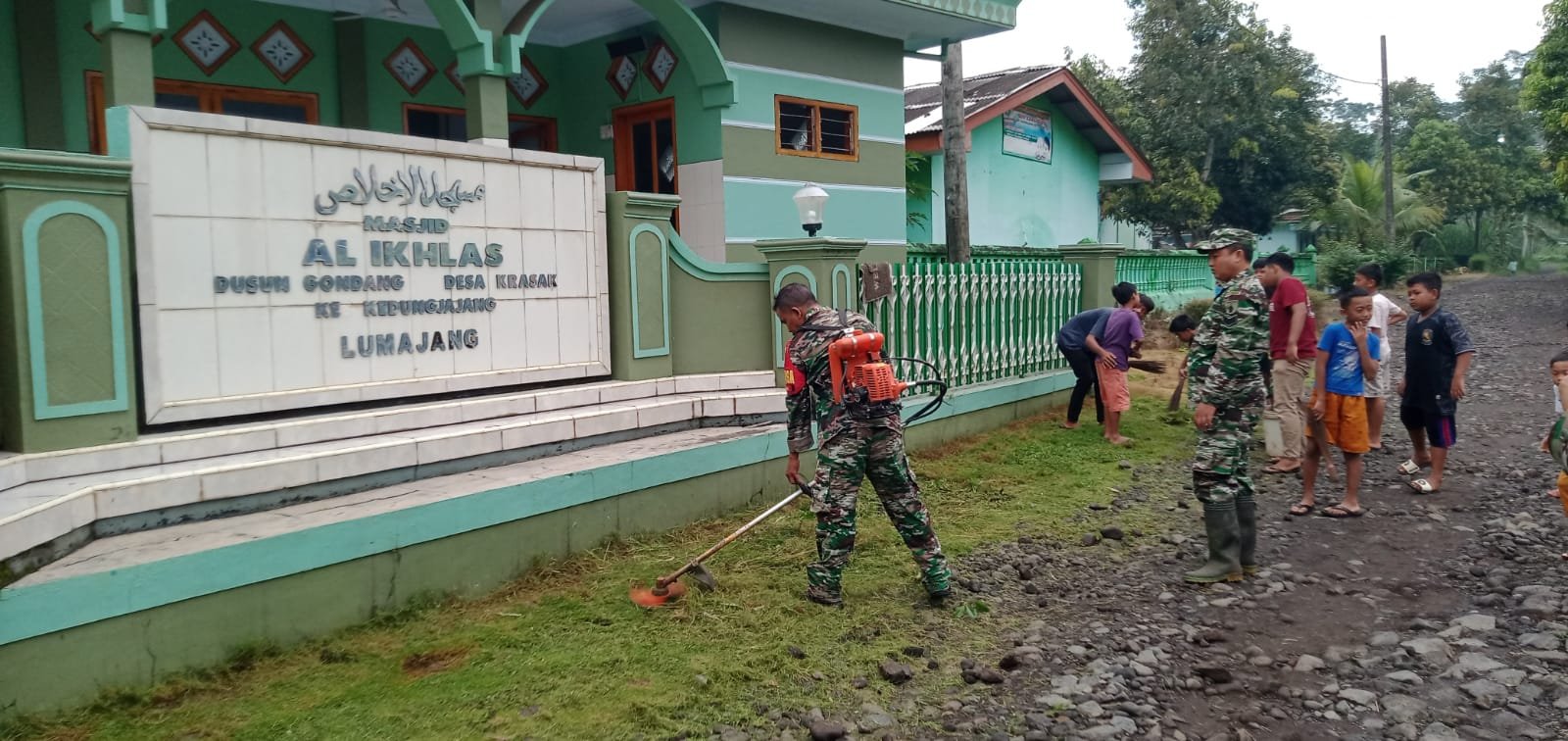 Lumajang, Dalam rangka menyambut bulan suci Ramadhan, Babinsa Krasak Posramil 0821-05/Kedungjajang, Serka Rinto Harahap, bersama warga setempat menggelar kerja bakti pembersihan area Masjid Al Ikhlas. Kegiatan yang dilaksanakan di Dusun Gondang, RT 001/RW 010, Desa Krasak, Kecamatan Kedungjajang, Kabupaten Lumajang, Jawa Timur, pada Jumat (28/2/2025).