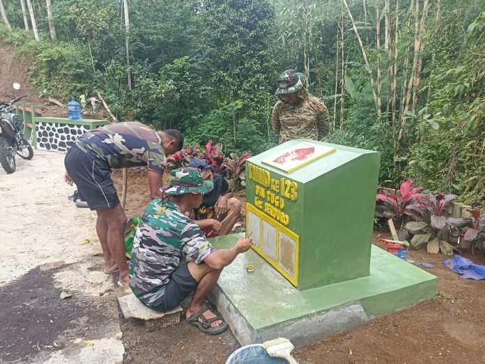 Lumajang, TMMD ke-123, Personel Satuan Tugas (Satgas) TNI Manunggal Membangun Desa (TMMD) ke-123 Kodim 0821/Lumajang terus mempercepat proses pengecatan prasasti TMMD di Dusun Tugu, Desa Burno, Lumajang, Senin (17/3/2025). Upaya ini dilakukan menjelang penutupan program yang dijadwalkan berlangsung pada 20 Maret 2025.