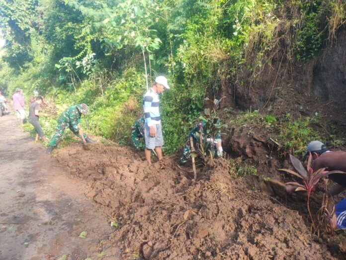 Longsoran tanah yang terjadi akibat intensitas hujan tinggi sempat menghambat mobilitas warga, terutama aktivitas ekonomi dan akses menuju lahan pertanian. Tanpa menunggu lama, Babinsa bersama masyarakat turun langsung ke lokasi dengan peralatan seadanya, mulai dari cangkul, sekop, hingga angkong, membersihkan material tanah yang menutup badan jalan.