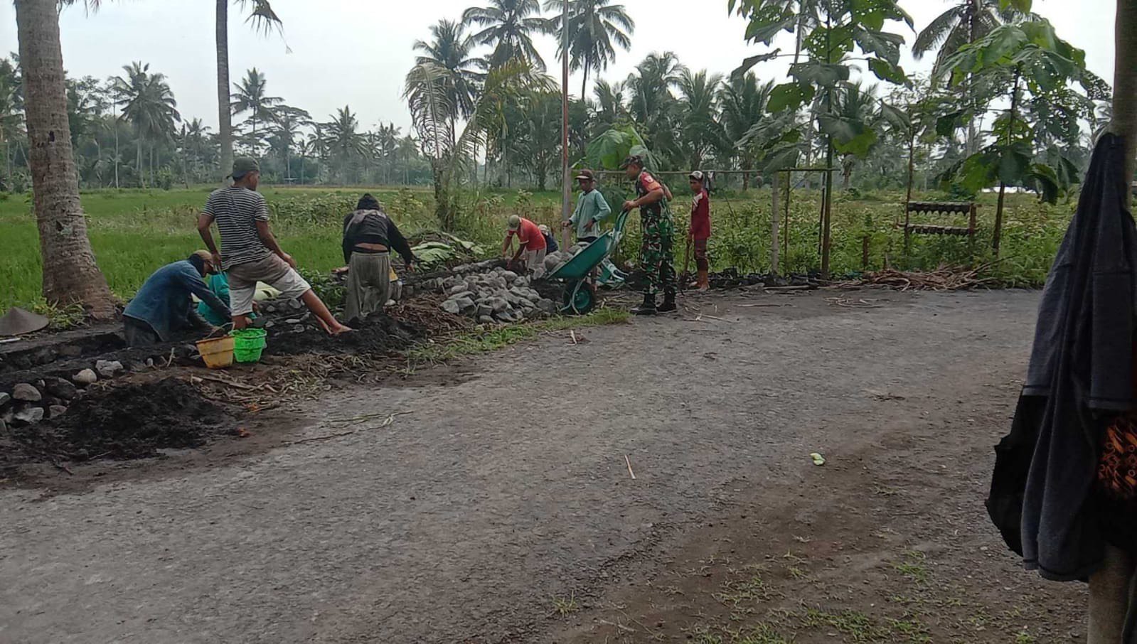 Lumajang — Babinsa Sememu Koramil 0821-08/Pasirian, Sertu Rochibul Imam, turut serta mengawal sekaligus membantu warga dalam pembangunan drainase sepanjang 500 meter di Dusun Ketewel Timur RT 009 RW 006, Desa Sememu, Kecamatan Pasirian, Kabupaten Lumajang, Jawa Timur, pada Selasa (2/12/2025).