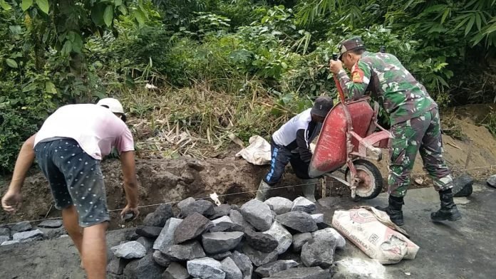 Lumajang, Untuk mencegah kerusakan infrastruktur jalan, Babinsa Tambahrejo Koramil 0821-09/Candipuro, Serda Debby Elmansyah, bersama warga Dusun Besuki, melaksanakan kegiatan kerja bakti pembangunan drainase sepanjang 650 meter di RT 002 RW 003 Desa Tambahrejo, Kecamatan Candipuro, Kabupaten Lumajang, Jawa Timur, Sabtu (28/9/2024).