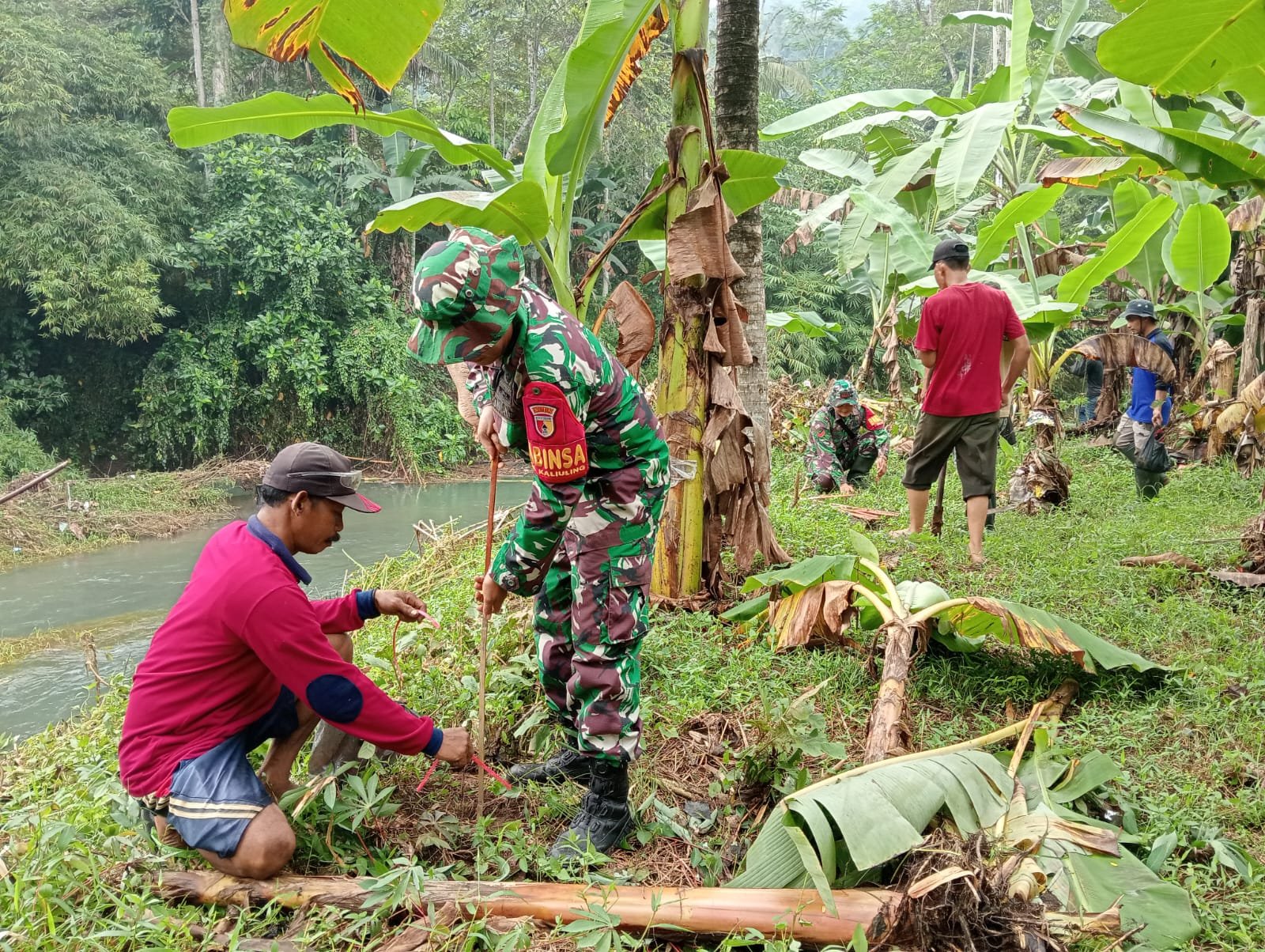 Lumajang, Dalam upaya melestarikan lingkungan dan mencegah bencana alam seperti longsor dan banjir, Babinsa Tempursari Koramil 0821-18/Tempursari, Peltu Dwi Hasim As'ari bersama sejumlah relawan melaksanakan kerja bakti penghijauan di sepanjang bantaran Sungai Rawaan, Desa Tempursari, Kecamatan Tempursari, Kabupaten Lumajang, Jawa Timur, Kamis (22/5/2025).