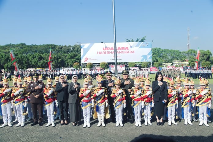 Lumajang — Kodim 0821/Lumajang bersama Forkopimda Kabupaten Lumajang menghadiri upacara peringatan Hari Ulang Tahun (HUT) Bhayangkara ke-79 yang digelar Polres Lumajang di Alun-alun Kabupaten Lumajang, Selasa (1/7/2025).