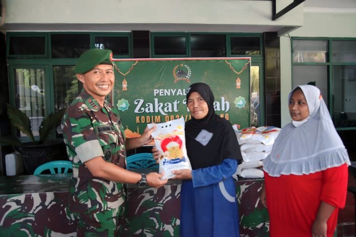 Lumajang, Dalam rangka menyambut datangnya Hari Raya Idulfitri 1445 H, Kodim 0821/Lumajang menyalurkan zakat fitrah kepada warga masyarakat kurang mampu, bertempat di Halaman Makodim 0821/Lumajang, Jumat (5/4/2024).