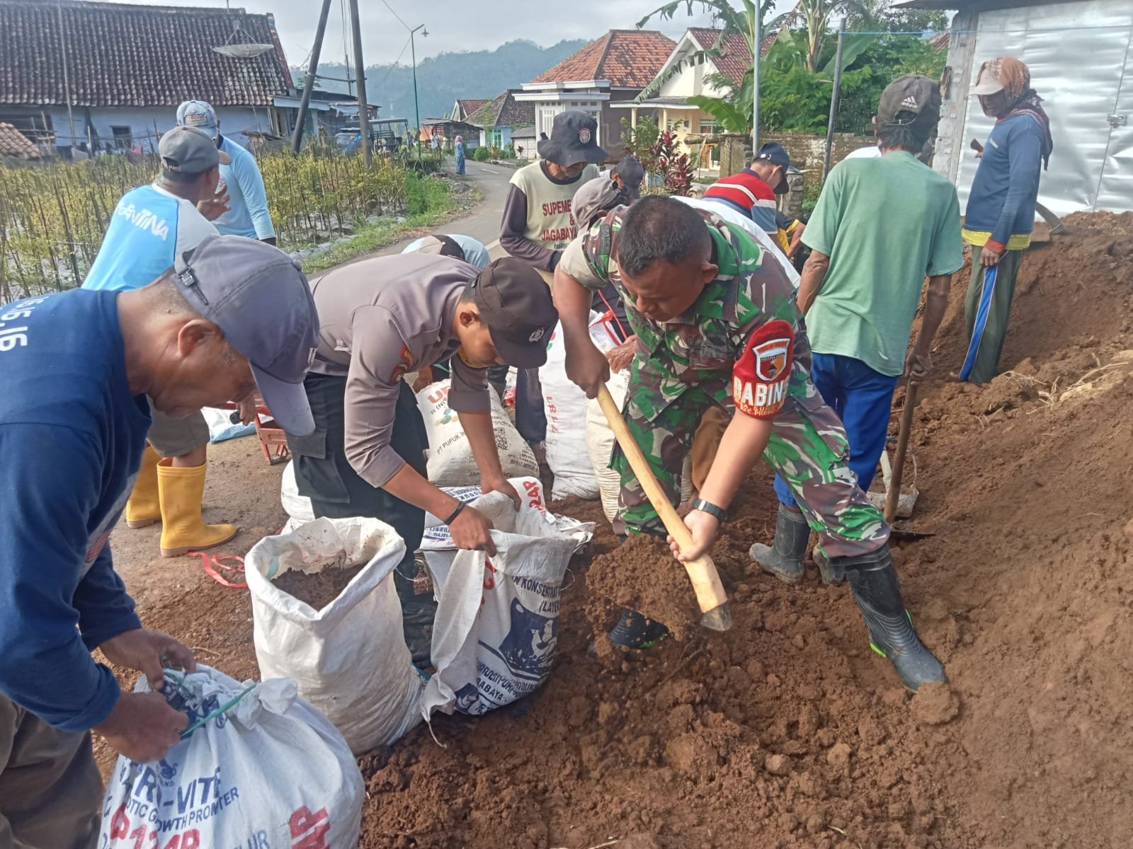 Sebagai garda terdepan dalam menjaga keamanan dan kesejahteraan masyarakat, Babinsa Sumberurip, Sertu Hidayat, dan Babinkamtibmas Sumberurip, Bripda Alfian, mengambil inisiatif untuk bergabung dengan warga serta relawan dalam melaksanakan pembangunan tanggul darurat di bahu jalan Dusun Krajan.