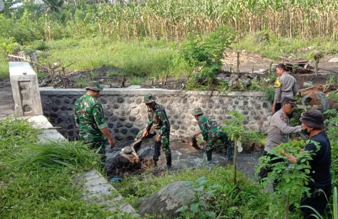 Aparat dan warga bahu-membahu membersihkan sampah serta material yang menghambat aliran sungai. Pembersihan dilakukan untuk memastikan fungsi sungai tetap optimal, terutama dalam mengantisipasi potensi banjir dan menjaga kebersihan lingkungan sekitar.