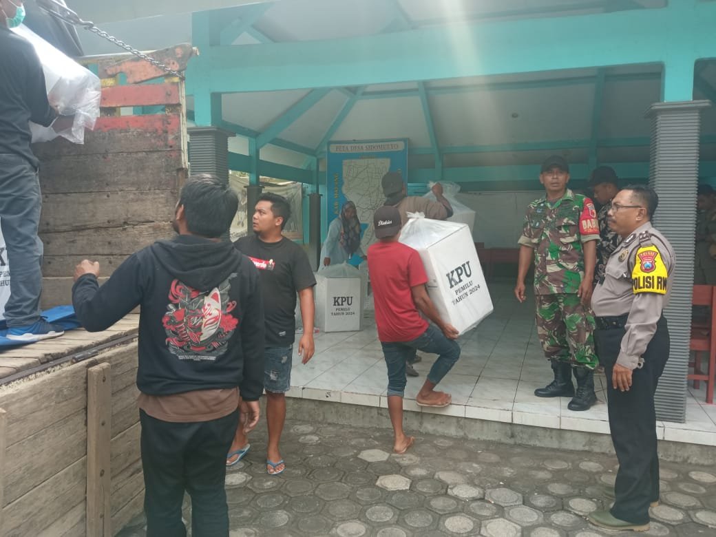 Kolaborasi bersama TNI-Polri yang melibatakan personel dan stakeholder Kecamatan Pronojiwo, langsung melakukan pengawalan pendistribusian logistik pemilu menuju PPS dan TPS se wilayah yang ada di Kecamatan Pronojiwo Kabupaten Lumajang, Jawa Timur, Senin (12/02/2024).