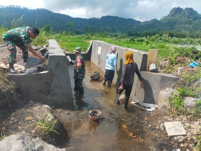 Lumajang, Babinsa Sumberurip Koramil 0821-14/Pronojiwo, Koptu M. Arif Wibowo, bersama masyarakat melaksanakan karya bakti lanjutan pada tahap akhir pembangunan saluran irigasi untuk mendukung sektor pertanian di Desa Sumberurip, Kecamatan Pronojiwo, Kabupaten Lumajang, Jawa Timur, pada Selasa (3/12/2024).