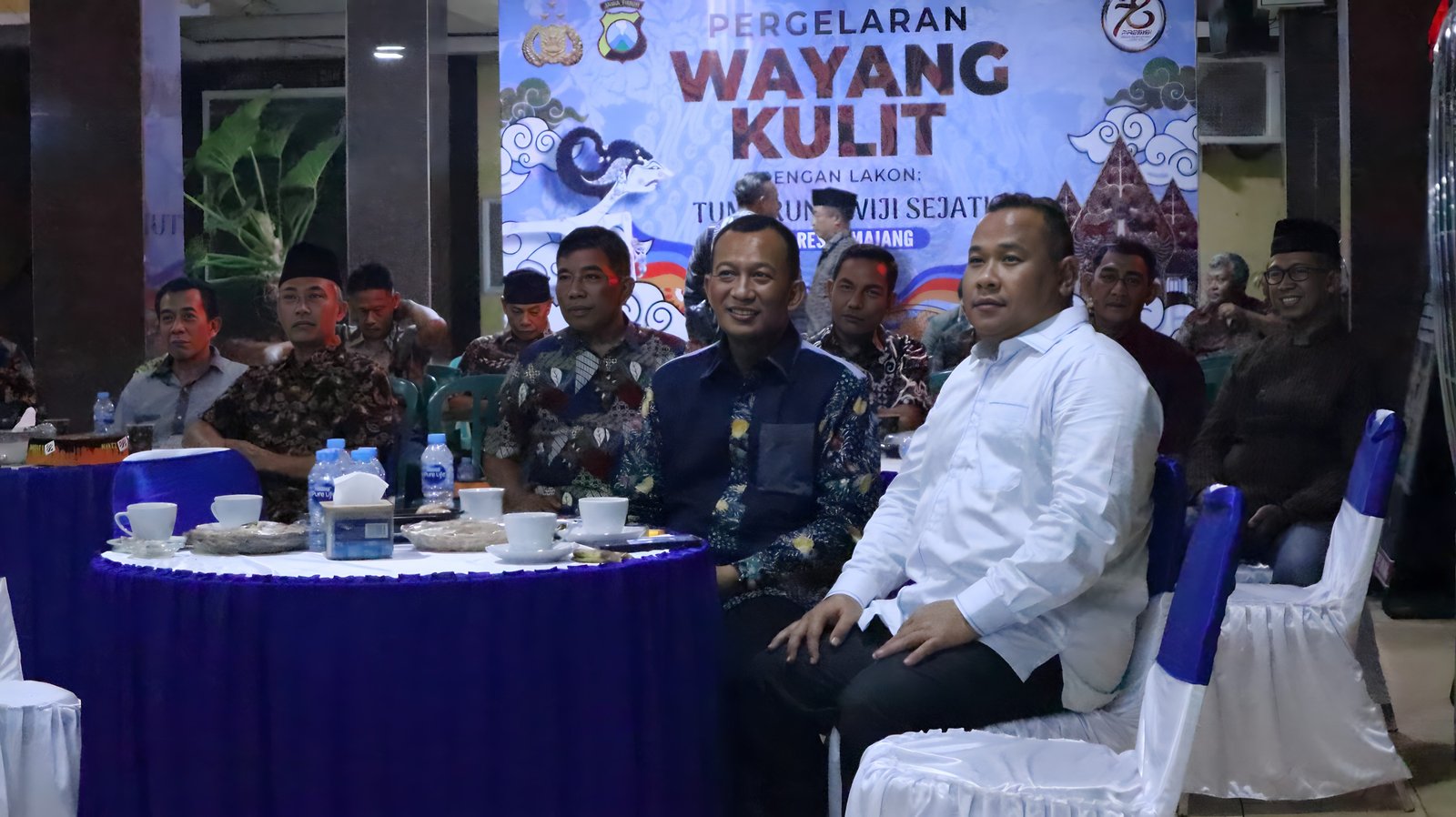 Lumajang, Dandim 0821/Lumajang Letkol Inf Ronny Wijaya Koesuma bersama Kapolres Lumajang AKBP Mohammad Zainur Rofik mengikuti acara nonton bareng (nobar) wayang kulit dengan lakon “Tumurune Wiji Sejati,” bertempat di Mapolres Lumajang Jalan Alun-alun Utara Lumajang Jawa Timur, Jumat (5/7/2024) malam.