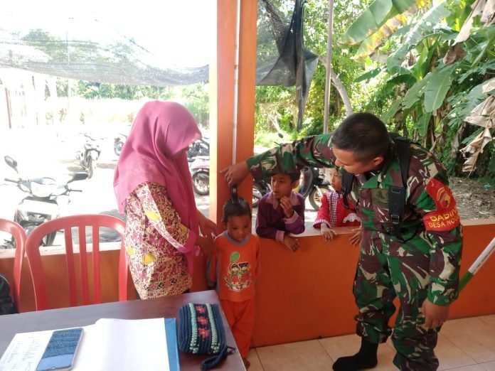 Lumajang, Babinsa Nogosari Koramil 0821/16 Rowokangkung Serda Agus Setiawan, melaksanakan kegiatan pendampingan monitoring kesehatan warga Balita dan Ibu Hamil di Posyandu Nabila Dusun Darungan RT 012 RW 005 Desa Nogosari Kecamatan Rowokangkung Kabupaten Lumajang, Rabu (3/1/2024).