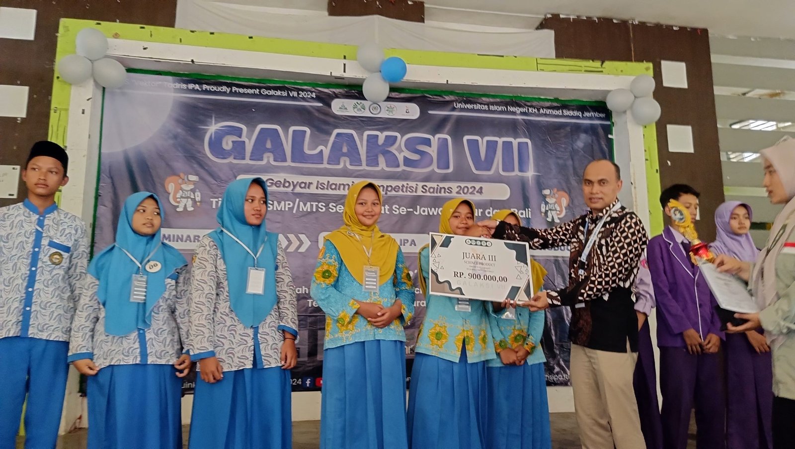 Lumajang – Tim kreatif dari MTsN 1 Lumajang berhasil meraih prestasi gemilang dengan menempati posisi Juara 3 dalam kompetisi Science Product pada ajang Gebyar Islami Kompetisi Sains (GALAKSI) 2024. Acara tahunan yang diselenggarakan oleh Himpunan Mahasiswa Program Studi (HMPS) Tadris Ilmu Pengetahuan Alam (IPA) Fakultas Tarbiyah dan Ilmu Keguruan (FTIK) Universitas Islam Negeri (UIN) Kiai Haji Achmad Shiddiq (KHAS) Jember ini diikuti oleh peserta dari SMP/MTs sederajat se-Jawa Timur dan Bali.