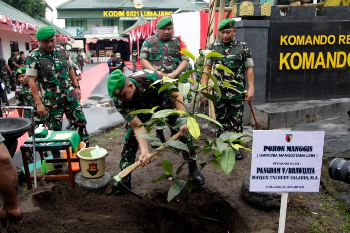 Dalam kunjungannya, Pangdam dan Ny. Vira Rudy Saladin melakukan penanaman pohon buah Manggis di area Makodim 082/Lumajang sebagai bentuk komitmen terhadap pelestarian lingkungan.