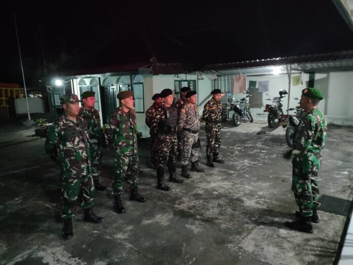 Lumajang, Dalam rangka memperkuat sinergi dan kepedulian terhadap keamanan lingkungan, Bati Tuud Koramil 0821-14/Pronojiwo, Peltu Danang Widiatmoko bersama anggota melaksanakan kegiatan Binter Mitigasi dan patroli wilayah berkolaborasi dengan Banser Satkoryon Pronojiwo. Kegiatan tersebut berlangsung di wilayah Kecamatan Pronojiwo, Kabupaten Lumajang, Jawa Timur, pada Rabu malam (24/9/2025).