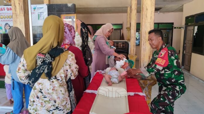 Lumajang, Komitmen TNI AD dalam mendukung peningkatan kualitas kesehatan masyarakat kembali ditunjukkan melalui peran aktif Babinsa di wilayah binaan. Babinsa Karanganyar Koramil 0821-11/Yosowilangun, Sertu Taufiq Abdul Lukito, melaksanakan pendampingan sekaligus monitoring kegiatan Posyandu yang digelar di Kantor Desa Karanganyar, Kecamatan Yosowilangun, Kabupaten Lumajang, Jawa Timur, pada Rabu (18/3/2026).