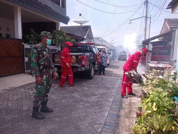 Lumajang, Babinsa Kedungjajang Posramil 0821/05 Kedungjajang Serda Edi Supriyanto, melaksanakan pendampingan kegiatan fogging massal yang digelar Puskesmas Kedungjajang, berlokasi di tiga lokasi lingkungan Perumahan Prima Indah RW 004 Desa Kedungjajang Kecamatan Kedungjajang Kabupaten Lumajang, Jawa Timur, Jumat (16/2/2024).