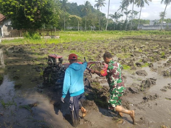 Lumajang, Dalam upaya mendukung program ketahanan pangan nasional, Babinsa Desa Condro Koramil 0821-08/Pasirian, Sertu Joko Pramono, terjun langsung mendampingi petani melakukan pengolahan lahan pertanian di Dusun Gentengan, Desa Condro, Kecamatan Pasirian, Kabupaten Lumajang, Jawa Timur. Sabtu (21/12/2024).