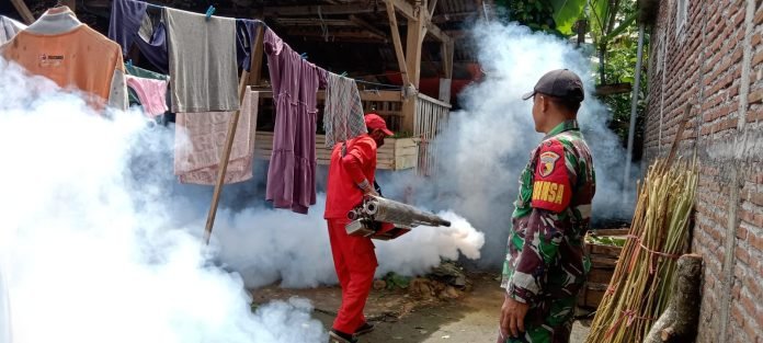 Lumajang, Dalam upaya mencegah penyebaran penyakit demam berdarah (DBD), Babinsa Senduro Koramil 0821-03/Senduro, Serka Pribawono, mendampingi Dinas Kesehatan Kabupaten Lumajang dalam kegiatan fogging yang dilaksanakan di kompleks Makoramil dan pemukiman warga Dusun Sumberejo RW 09, Desa Senduro, Kecamatan Senduro, Kabupaten Lumajang, Jawa Timur, pada Rabu (18/12/2024).