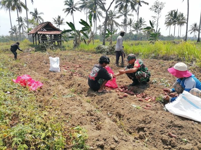 Lumajang, Babinsa Kertosari Koramil 0821-17/Pasrujambe, Serda Amil Fahrudin, Serda Amil Fahrudin melaksanakan pendampingan kepada para petani dalam proses panen ubi jalar atau ketela rambat di lahan seluas 0,5 hektar milik Bapak Hartono, anggota kelompok tani (Poktan) Kertojoyo V, yang terletak di Dusun Krajan, Desa Kertosari, Kecamatan Pasrujambe, Kabupaten Lumajang, Jawa Timur, pada Rabu (2/10/2024).