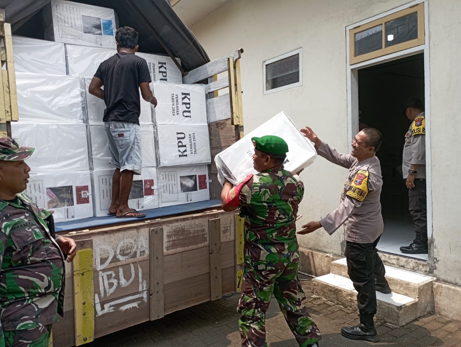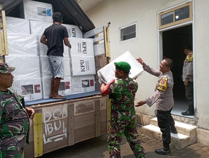 Lumajang – Personel Posramil 0821-05/Kedungjajang bersama Forkopimcam Kedungjajang melaksanakan pengawalan distribusi logistik Pilkada Serentak dari Gudang Panitia Pemilihan Kecamatan menuju PPS di seluruh desa se-Kecamatan Kedungjajang, Kabupaten Lumajang, Jawa Timur, pada Selasa (26/11/2024).