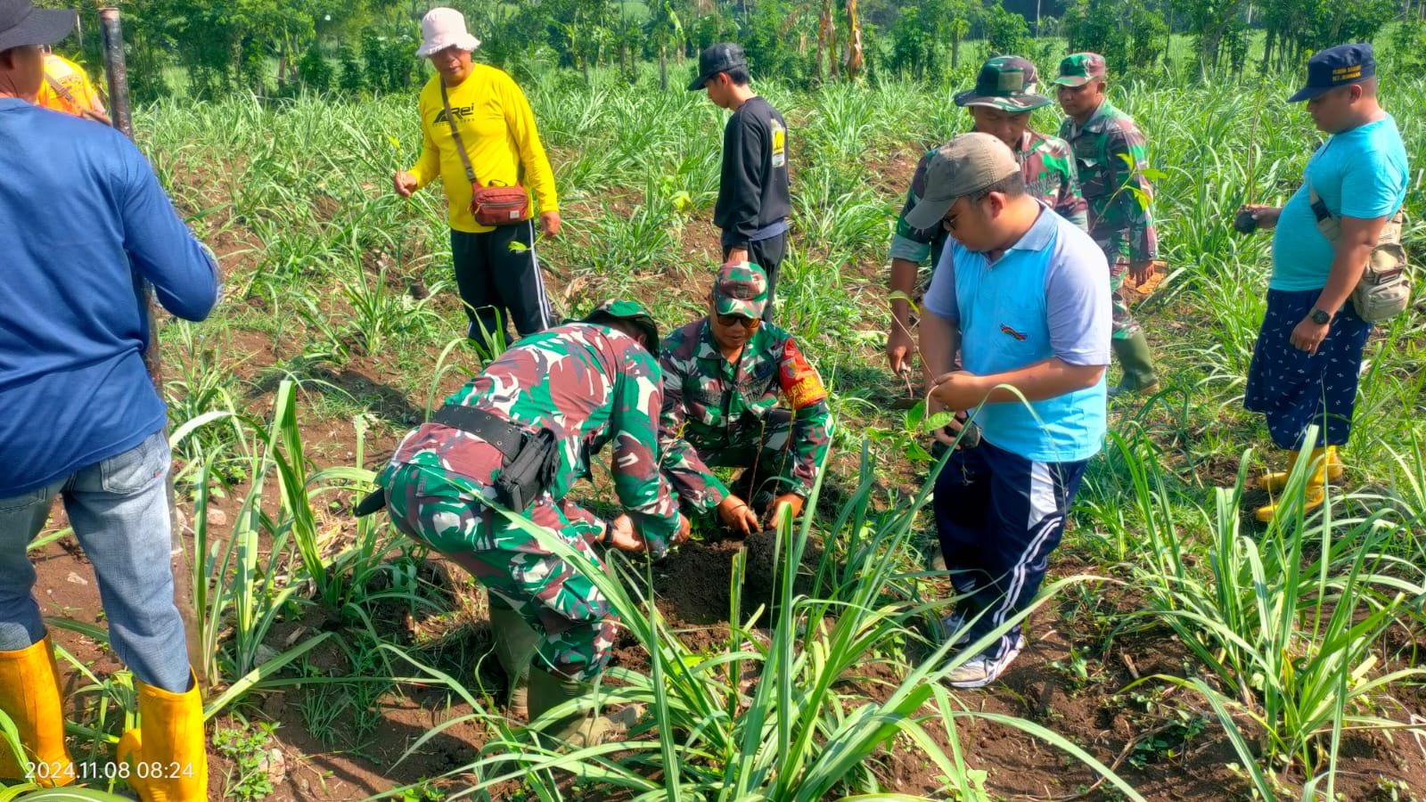 Lumajang,  Dalam upaya menjaga kelestarian lingkungan, Babinsa Kebonagung Koramil 0821-02/Sukodono, Sertu Lolok Wahyudi, bersama warga melaksanakan kegiatan penghijauan dengan menanam pohon sukun di Dusun Kebonarang RT 003 RW 005 Desa Kebonagung, Kecamatan Sukodono, Kabupaten Lumajang, Jawa Timur, pada Sabtu (16/11/2024).